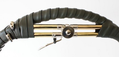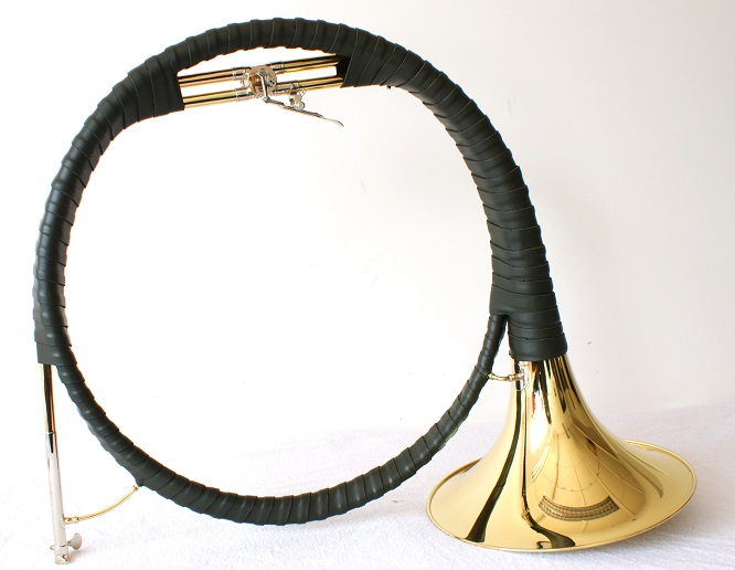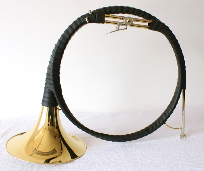 Es-B-Parforce-Jagdhorn in Messing, extra weiter Waldhornbecher, 30 cm Durchmesser, echte Lederwicklung, doppelkonischer Neusilberstimmzug, Goldmessing-Mundrohr, Umschaltventil Meinlschmidt, 2 Minibalgelenke, 2 Wasserventile, Einbrennlackierung, Kreisdurchmesser 44 cm, Mundstueck versilbert