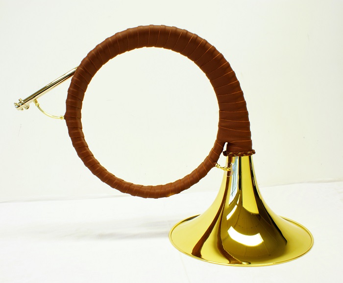 B-Parforce-Jagdhorn in Messing, echte Lederwicklung, Stimmzug, zweiwindig, Einbrennlackierung, duennwandiger Schallbecher 30 cm, mit versilbertem Mundstueck, Stuetzen rund gebogen