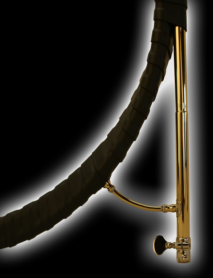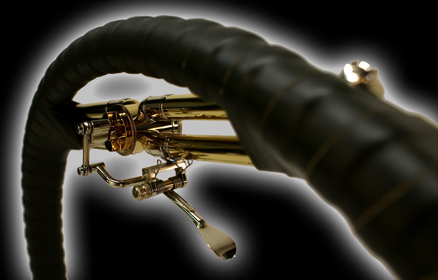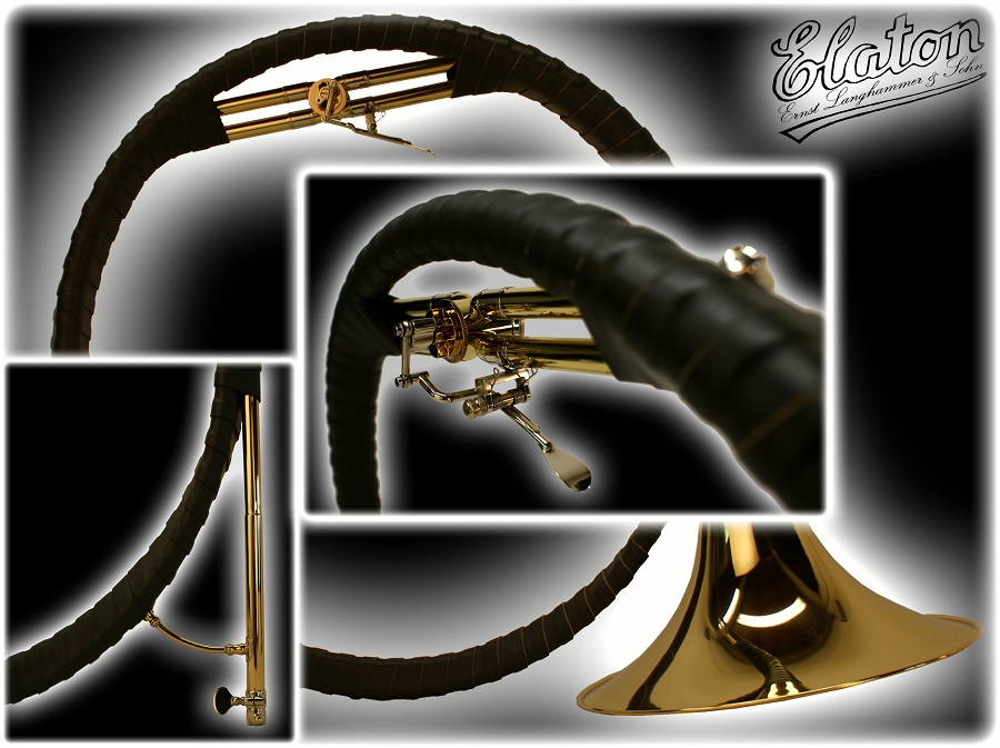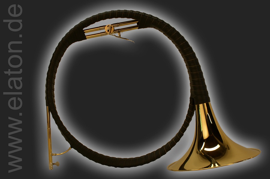 Es-B-Parforce-Jagdhorn, Messingkorpus, echte Lederwicklung, Stimmzug, Meinlschmidt Umschaltventil, 1 Wasserventil, Kreis 44 cm, duennwandiger Schallbecher 30 cm, lackiert, Mundstueck