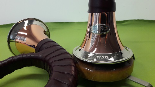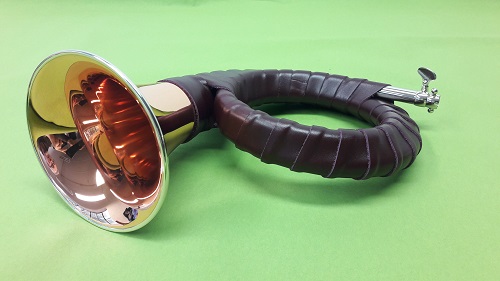 B-Fuerst-Plesshorn, weite Bauart, Goldmessingkorpus und Kupfer-Schallbecher, mit echter Lederwicklung und Tragriemen in bordeauxrot, Neusilber-Stimmzug, Schallbecher 13 cm, Neusilberkranz und Gravur im Neusilberkranz, lackiert und versilbertem Mundstueck