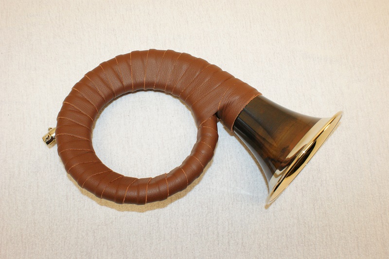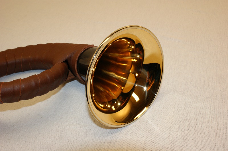 B-Fuerst-Plesshorn in Goldmessing, weite Bauart, Vintage-Style, echte Lederwicklung braun, Tragriemen, Neusilberstimmzug, Einbrennlackierung, duennwandiger Schallbecher, Neusilberkranz, Mundstueck versilbert