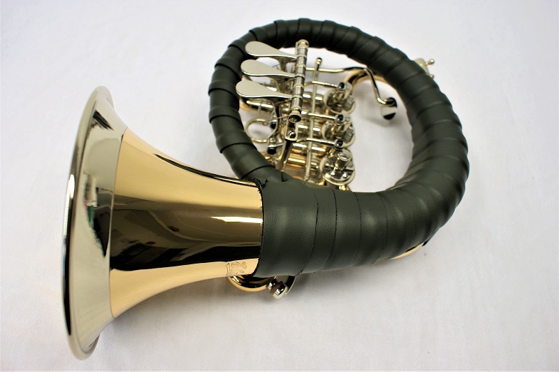 B-Fuerst-Plesshorn "Wiener Modell" weitere Mensur , Becher 14 cm, Goldmessingkorpus, 3 Zylinderventile, 0,40 Wandung, langer Neusilber-Stimmzug fuer extra Mundrohr, Trigger am 3. Ventilzug, 3. Zug echte Wasserklappe, echte Lederwicklung, Tragriemen, Doppelminibalgelenke, lackiert, mit Mundstueck