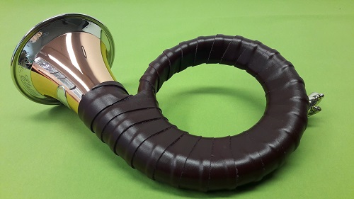 B-Fuerst-Plesshorn, weite Bauart, Kupferkorpus mit echter Lederwicklung und Trageriemen in bordeauxrot, Neusilber-Stimmzug, Schallbecher 13 cm, Neusilberkranz und Gravur im Neusilberkranz, lackiert, mit versilbertem Mundstueck